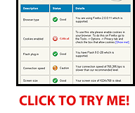 This test ensures the browser is IE 6+, FF 2+, Safari 2+, or Opera 9+ and that the user has a broadband connection